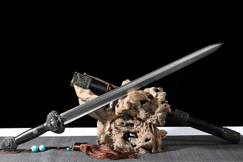 24寸永樂劍 材質(zhì): 花紋鋼八面 黑檀殼 手工雕銅翻砂銅黑拉絲 咖啡帶玉貔貅劍穗 包裝:麻布木盒裝 真絲袋 收藏證書 環(huán)保袋 6折小冊 說明書 白手套 小瓶刀油 保養(yǎng)卡