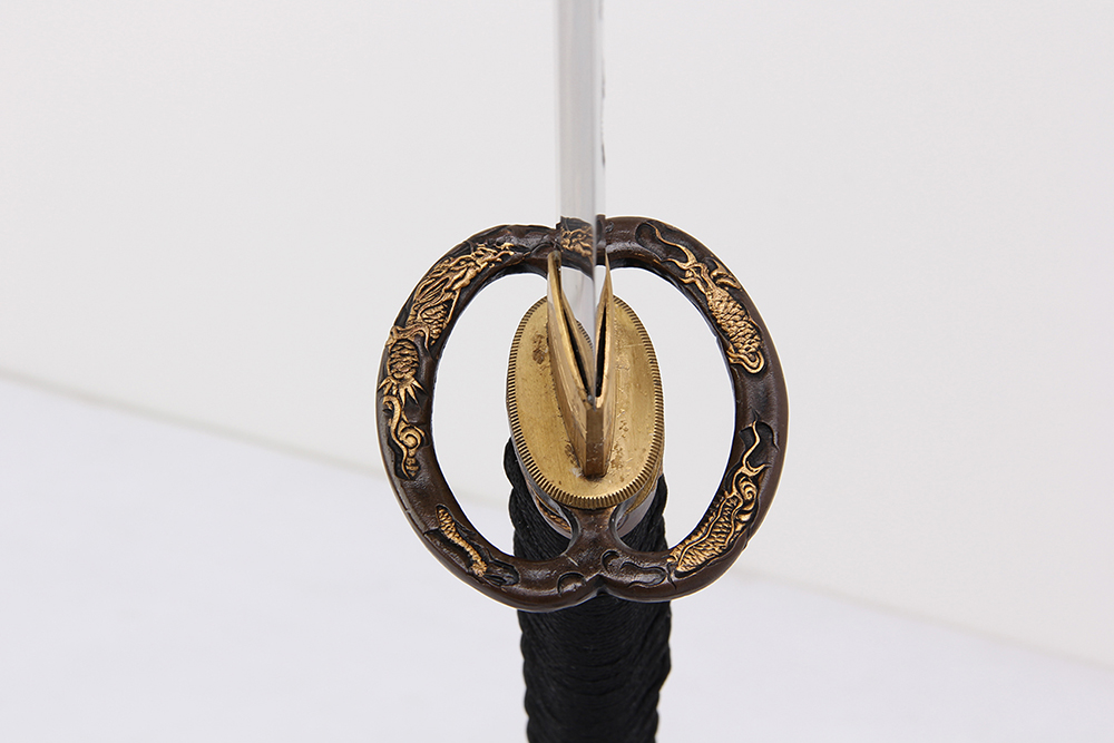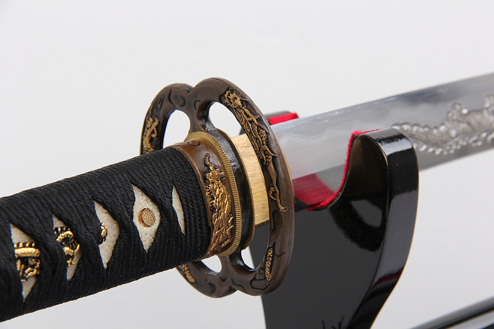 28寸高檔手工刀全長:104cm 刃長:68cm 柄長:28cm刃材:1095鋼燒刃無槽 刻梅花圖柄材:實木 繞好黑帶+真魚皮鞘材:實木 鑲嵌貝殼梅花圖、三個黑牛角,繞黑色真絲帶配件:銅;護盤流金銀包裝:梧桐木盒裝 帶大盒玉刀油銅錘 西班牙單層亮光刀架 黑色梅花真絲刀袋 黑說明書