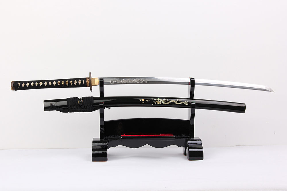 鞘材:實木黑色亮光漆 鑲嵌貝殼梅花圖三個黑牛角,繞黑色真絲帶