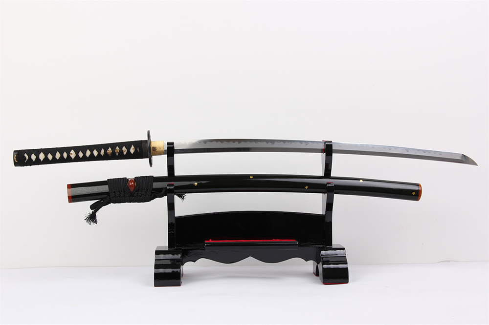 28寸高檔手工刀全長:104cm 刃長:68cm 柄長:28cm刃材:百煉花紋鋼燒刃高檔推磨無槽三色柄材:實木 繞黑色帶+真魚皮鞘材:實木黑亮光漆貼銅花三個黃牛角 繞黑色真絲帶配件:銅包裝:梧桐木盒裝 帶大盒玉刀油銅錘 西班牙單層亮光刀架 黃龍布袋 黑說明書