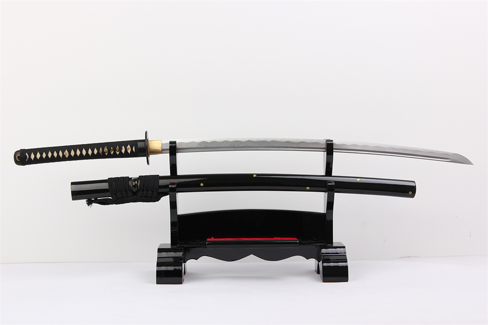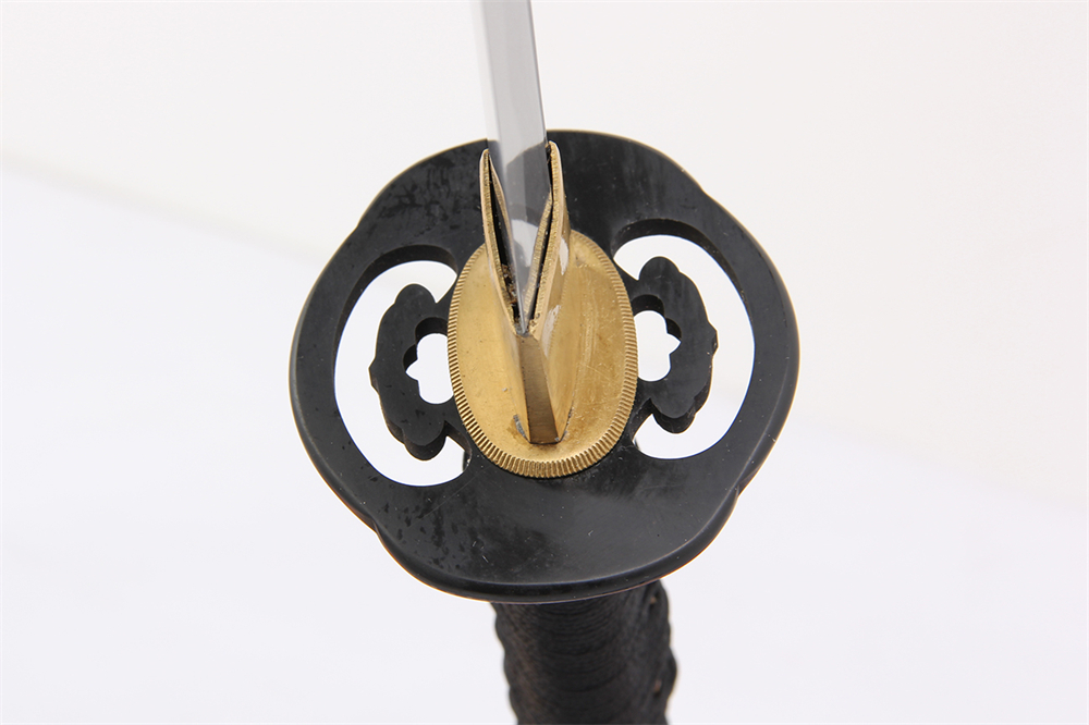 鞘材:實(shí)木黑亮光漆貼銅花 繞黑色真絲帶