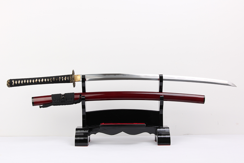 28寸高檔手工刀全長:104cm 刃長:68cm 柄長:28cm刃材:百煉花紋鋼四枚夾鋼燒刃無槽三色大頭柄材:實木 繞黑色帶+真魚皮鞘材:實木半透明酒紅漆三個黑牛角 繞黑色真絲帶配件:銅包裝:分體式梧桐木盒外加雙瓦紙盒裝 帶黑色梅花真絲刀袋 大盒玉刀油銅錘 西班牙式單層亮光刀架不印字貼紅布 黑說明書