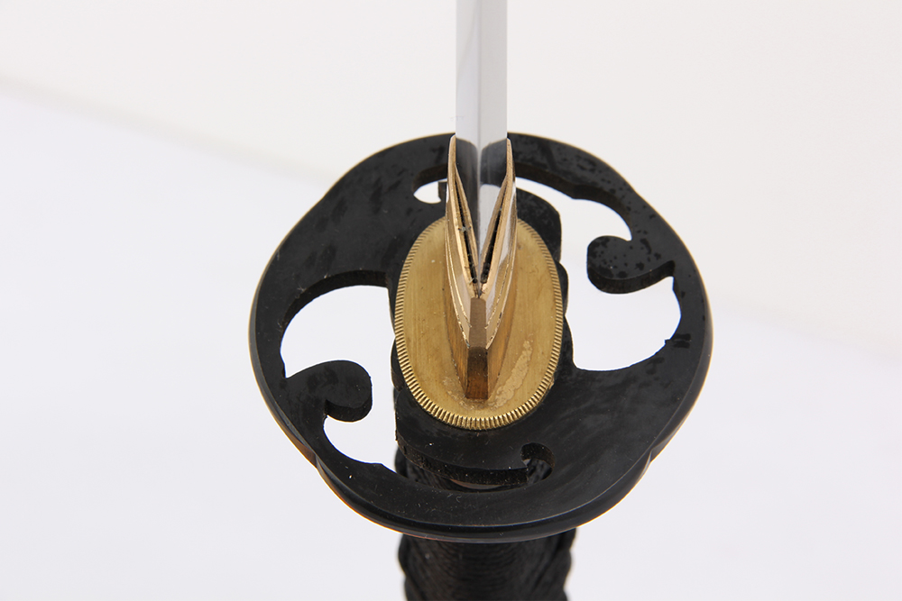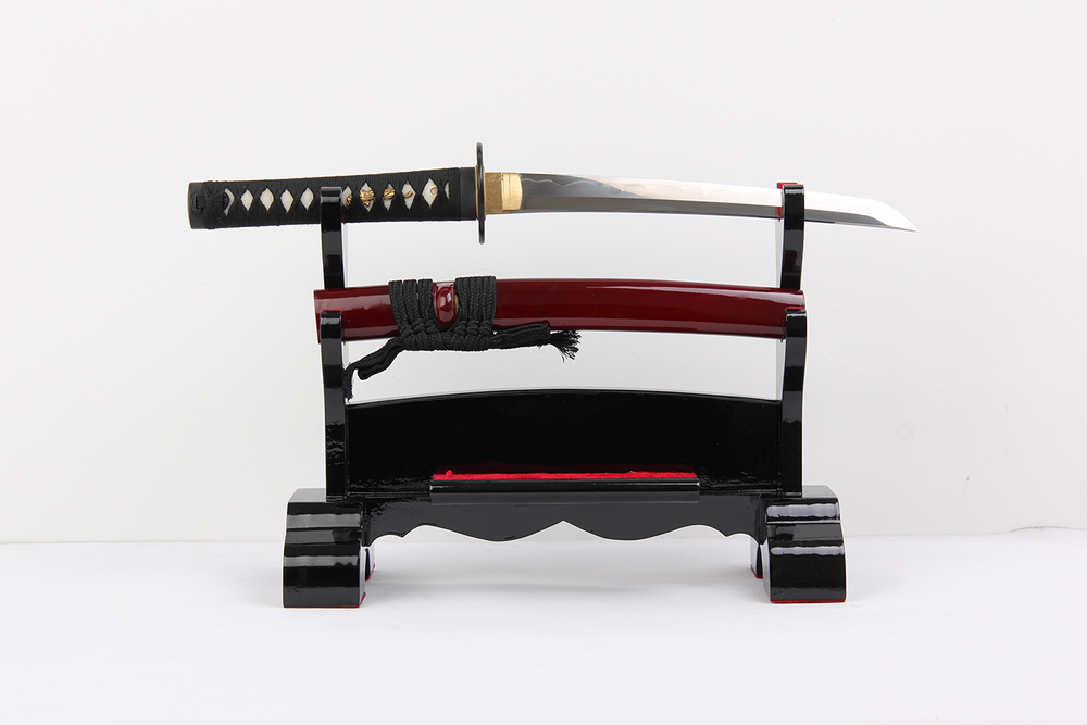 鞘材:實(shí)木半透明酒紅漆三個(gè)黑牛角 繞黑色真絲帶