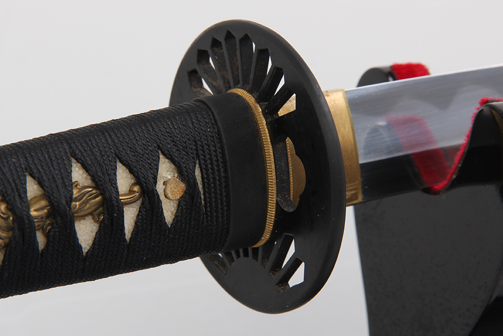 鞘材:實木黑亮光漆包半截黑魚皮三個黑牛角 繞黑色真絲帶