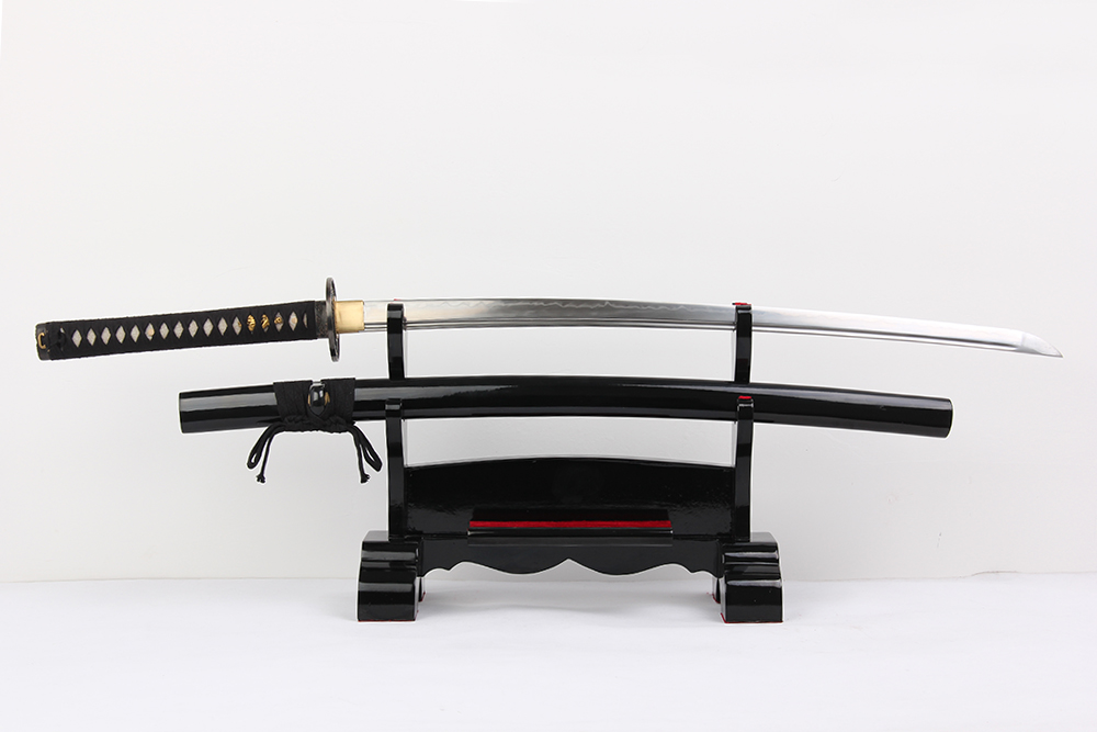28寸高檔手工刀全長:104cm 刃長:68cm 柄長:28cm刃材:1045鋼燒刃全槽有切線柄材:實木 繞黑棉帶+真魚皮鞘材:實木黑亮光漆 繞黑棉帶配件:銅包裝:黑彩盒 帶黑布袋