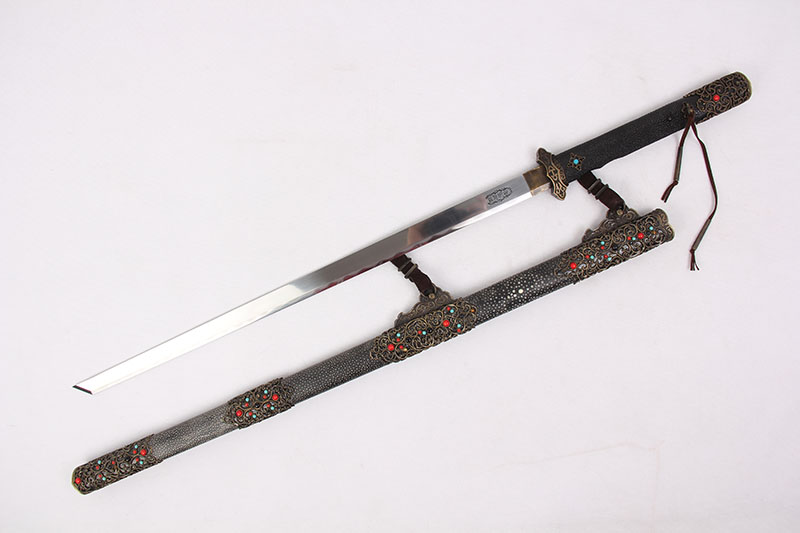 鄭氏刀劍鍛造唐刀,取精用宏前人傳承的優(yōu)良工藝。此刀,使用手工歷鍛、鏟、銼、刻、淬、磨等28道工序精制而成,全長110厘米,柄長27厘米,刃長70厘米,重1.84千克。直背扁平刀身切刃造,刃文細直呈纏連木紋狀。折邊刀鐔融承漢刀風格造型。木胎刀柄、刀鞘外覆鯊魚皮,再銅裝其體鏤雕飛云、花卉、唐草,并鑲嵌紅、藍、黑、黃四色珠寶裝飾。