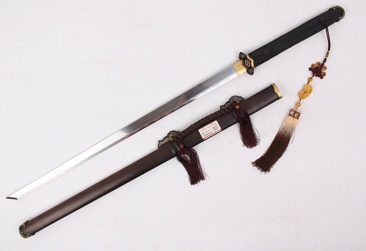 全長:103CM 刃長:77CM 柄長:23CM 劍身: 1095鋼燒刃刀鞘:黑檀木裝具:銅鏤空鍍金 包裝:木錦盒