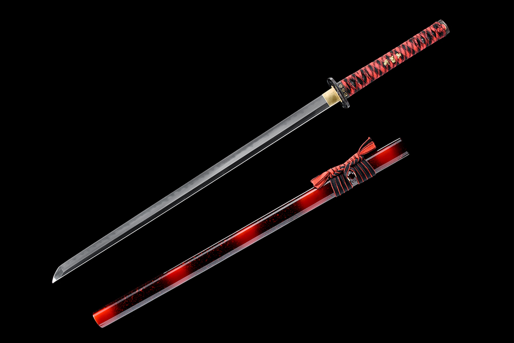 28寸手工刀-直款全長:104cm 刃長:68cm 柄長:28cm刃材:1045鋼燒刃無槽有切線柄材:實木 繞紅黑帶+真魚皮鞘材:實木黑底紅太陽帶紅點 繞紅黑帶配件:銅+鋅合金包裝:黑彩盒 黑布袋