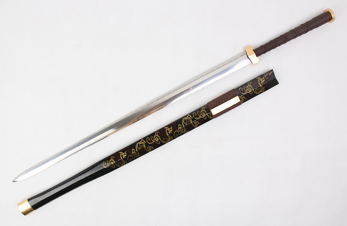 “安得倚天劍,跨海斬長鯨”。此劍,取式刀劍史籍漢劍圖文精制而成,全長111厘米,柄長26厘米,刃長80厘米,重1.68 千克。劍身,采用優(yōu)質(zhì)花紋鋼手工鍛打,覆土燒刃,高精研磨……千錘百煉之后,鋒刃銳利,剛?cè)岵⒃ⅲ缢?,煜煜吐花。劍鞘,采制龍泉高山名貴雞翅木黑色髹漆,并于鞘背兩向各紋飾七條飛龍呈倚天狀魚貫飛騰直上鞘口。劍格、柄首及劍鏢裝具,以八面劍身為依托,先以鎏銅方圓鑄模,再以鎏金呈細沙形星羅棋布點飾,寓意八面方圓,納福致祥。如此構(gòu)思制作,使此劍顯得古樸典雅,簡潔大方,又不失端莊華麗,大氣威武,而極具觀賞、收藏價值,可謂居家裝飾、饋贈親友之佳品。