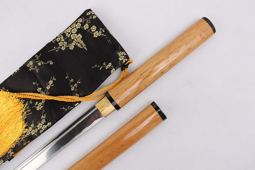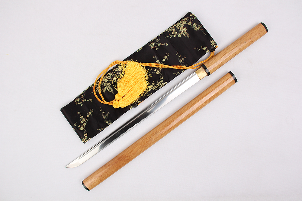 20寸手工刀全木形 直刀全長:79cm 刃長:53cm 柄長:24cm刃材:百煉花紋鋼全槽有花口有切線 柄材:白芋本色鞘材:白芋本色亮光帶4圈黑配件:銅包裝:雙瓦紙盒