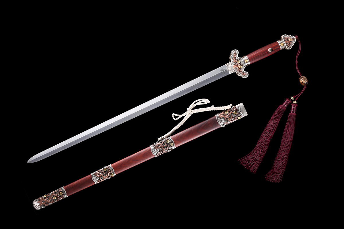 “寶劍鋒從磨礪出,梅花香自苦寒來(lái)”。此劍,是以上等花紋鋼、紫銅,天然蛇紋木、魚(yú)皮等為材料,取樣清劍風(fēng)貌,采用傳統(tǒng)手工技藝,歷鍛、鏟、銼、刻、磨……等28道工序精制而成。全長(zhǎng)105厘米,柄長(zhǎng)23 厘米,刃長(zhǎng)76 厘米,刃寬3.5厘米,重量2.2千克。劍身,以錨鐵夾鋼經(jīng)百煉鍛造后,鍔成鋒銳,剛?cè)岵⒃?,寒光逼人,其劍面四向錯(cuò)落有致、蜿蜒如練的流水紋,似四灣溪水從劍格處直瀉劍尖,靈動(dòng)出巧,妙趣天成。其如意形劍格、葫蘆式劍首、橢圓徑長(zhǎng)狀劍鞘上以50余克黃金、600余克白銀浮雕梅花如星辰般布列裝飾,意蘊(yùn)著花開(kāi)富貴喜盈門(mén),事業(yè)昌盛財(cái)源旺之福祿如意景觀,使整劍于婉約典雅中見(jiàn)端莊大氣,于豪放恢宏間彰顯人文與自然兩相宜之富麗高貴氣象。