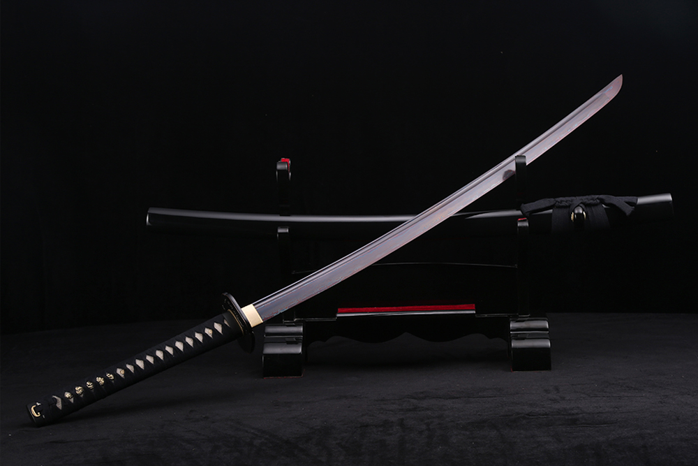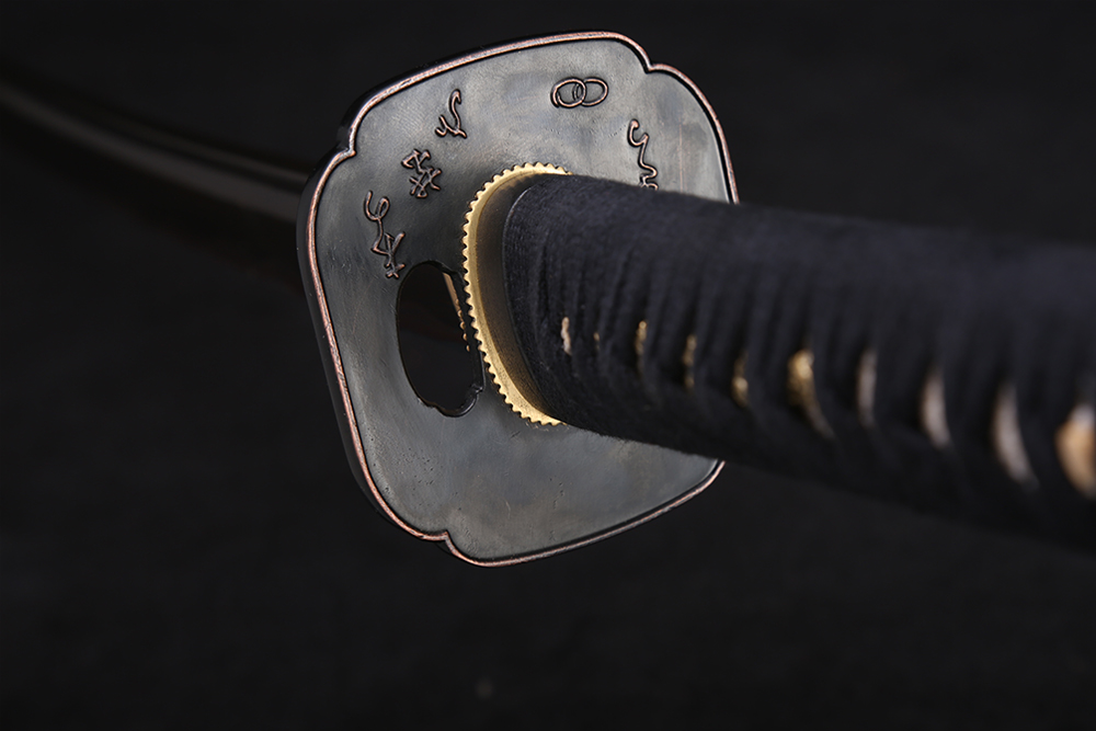 28寸手工刀全長(zhǎng):104cm 刃長(zhǎng):68cm 柄長(zhǎng):28cm刃材:百煉花紋鋼全槽電鍍藍(lán)色有花口有切線柄材:實(shí)木 繞黑棉帶+真魚(yú)皮鞘材:實(shí)木黑亮光漆 繞黑棉帶配件:銅包裝:彩盒裝 帶黑布袋