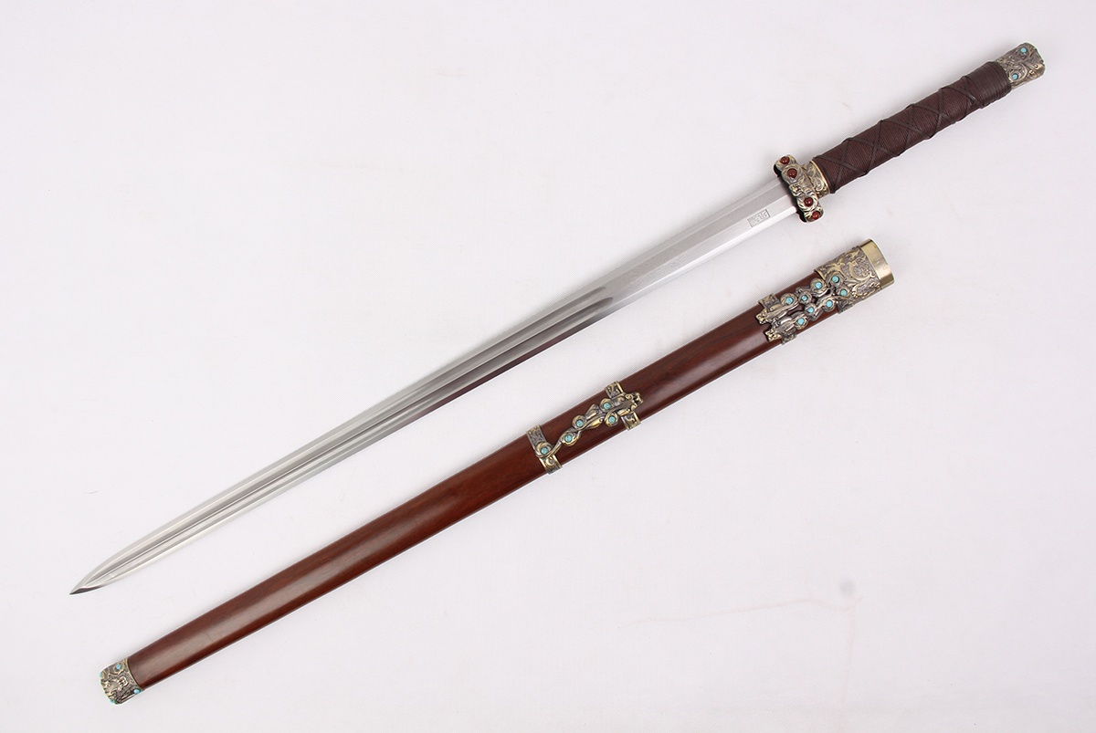 全長:111CM 刃長: 80CM 柄長:27CM 劍身: 百煉花紋鋼開雙槽刀鞘:酸枝木裝具:青古銅鑲嵌寶石包裝:錦盒