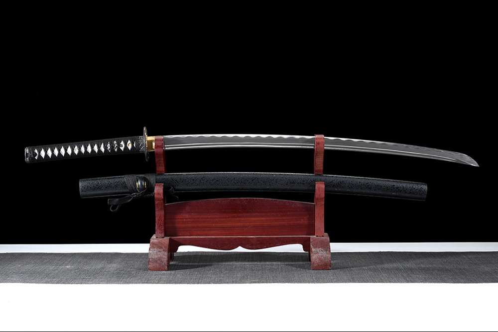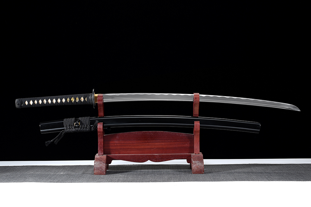 28寸手工刀全長(zhǎng):104cm 刃長(zhǎng):68cm 柄長(zhǎng):28cm刃材:百煉花紋鋼全槽有花口有切線(xiàn)柄材:實(shí)木 繞黑色帶+仿魚(yú)皮鞘材:實(shí)木啞光黑點(diǎn) 繞黑色帶配件:銅+鋅合金包裝:雙瓦紙盒 帶黑布袋