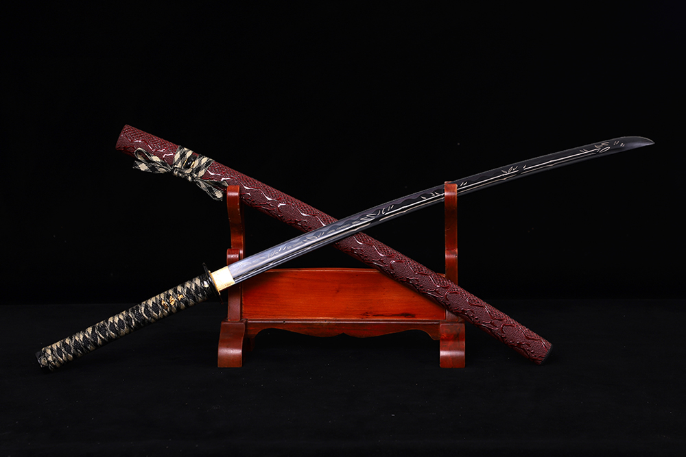 28寸手工刀全長(zhǎng):104cm 刃長(zhǎng):68cm 柄長(zhǎng):28cm刃材:1045鋼發(fā)黑全槽有花口有切線 激光刻竹柄材:實(shí)木 繞黃加黑帶+仿魚皮鞘材:實(shí)木包仿暗紅色蟒蛇皮 繞黃加黑帶配件:鋅合金包裝:雙瓦紙盒 帶黑布袋