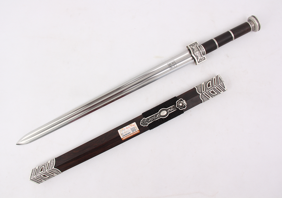 全長: 75CM 刃長: 54CM 柄長:15CM 劍身: 百煉花紋鋼八面開雙槽刀鞘:黑檀木裝具:銅沙銀包裝:錦盒