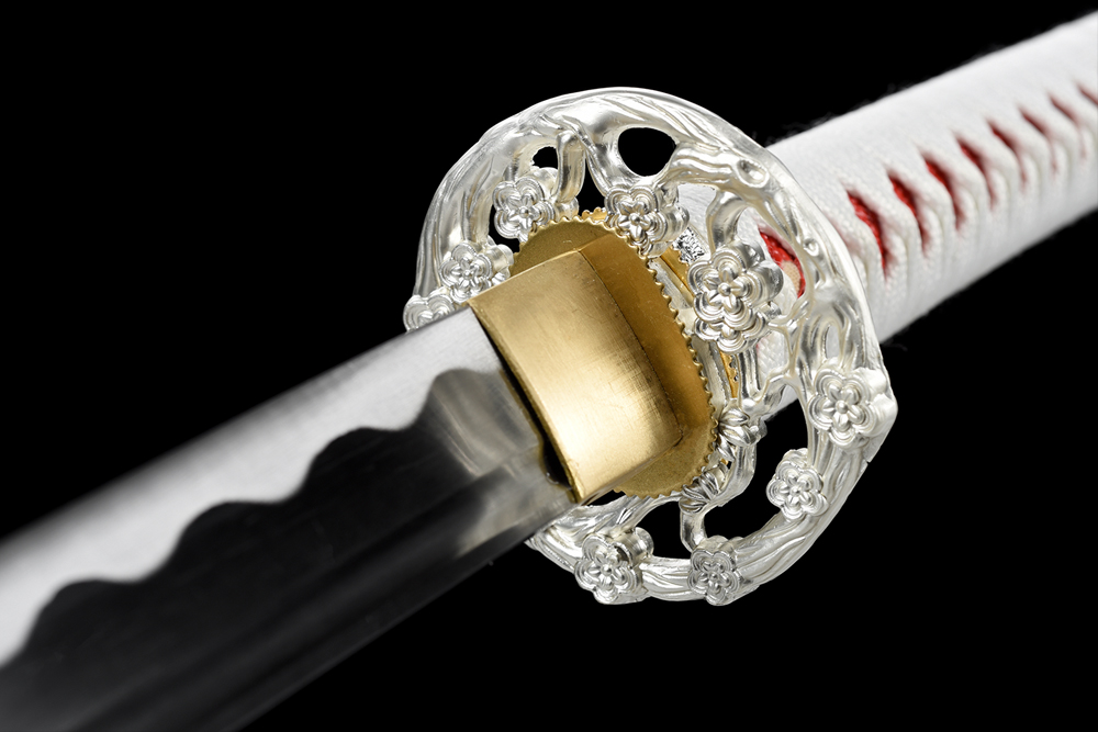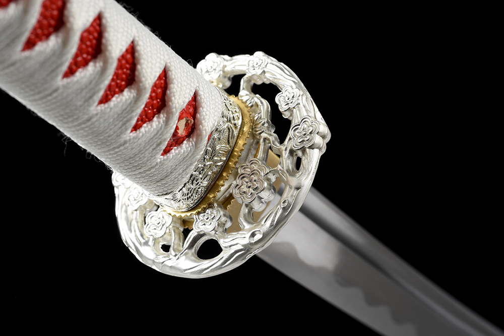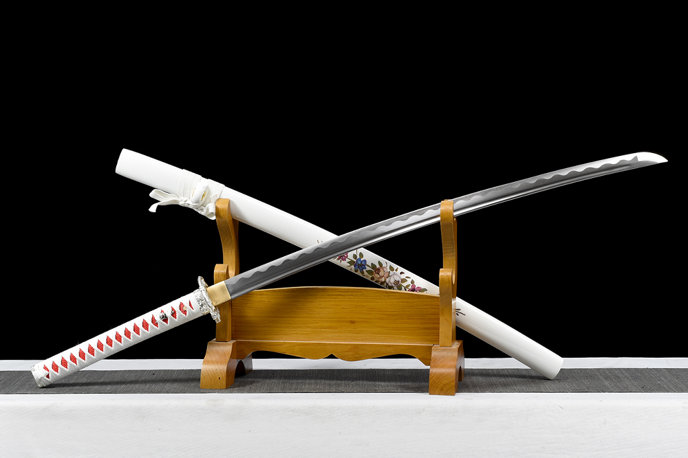 28寸手工刀全長:104cm 刃長:68cm 柄長:28cm刃材:1045鋼全槽有花口有切線柄材:實木 繞白色帶+仿魚皮鞘材:實木白亮光貼手繪6朵花 繞白色帶配件:鋅合金+銅包裝:雙瓦紙盒